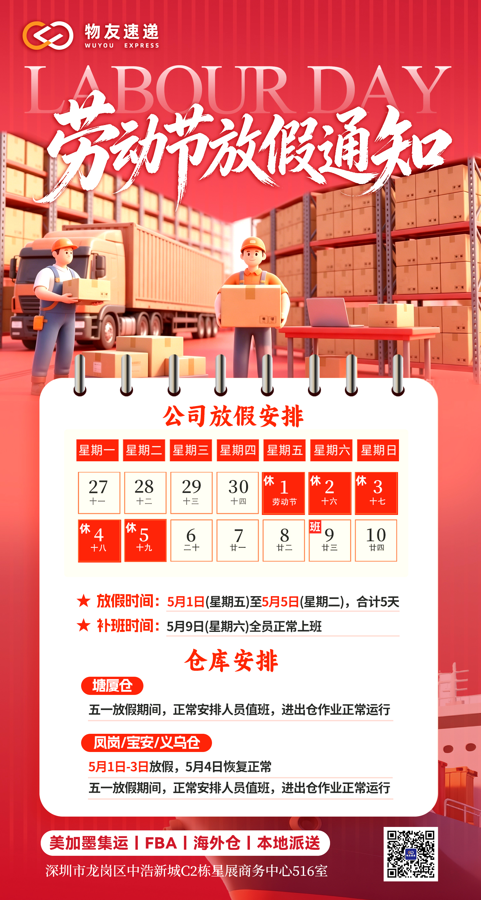 值此五一国际劳动节来临之际,为保障跨境电商卖家旺季备货、FBA 头程发货、海外仓补货需求,物友速递特别发布2026 年五一劳动节放假及仓库运营安排。假期期间,我司坚持仓库轮值、收货出货不间断,确保跨境物流链路稳定、高效、可追踪,全力守护客户货物准时出运。